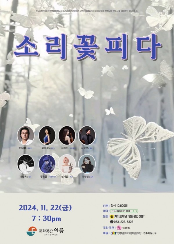 ○ 주요내용 : "소리꽃피다"는 서양의 클래식과 동양의 전통음악, 그리고 현대 음악의 요소들이 조화를 이루어 단순한 장르의 결합을 넘어, 서로 다른 음악적 전통과 스타일이 상호 작용하며 새로운 음악적 언어를 창출하는 실험적인 공간을 제공
